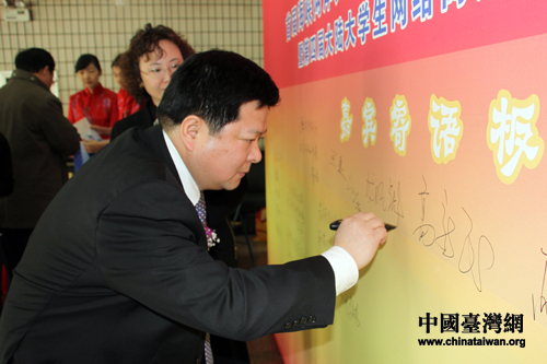 啟動儀式開始前,國務(wù)院臺辦主任助理龍明彪在嘉賓寄語板留言。 (中國臺灣網(wǎng) 王偉 攝)