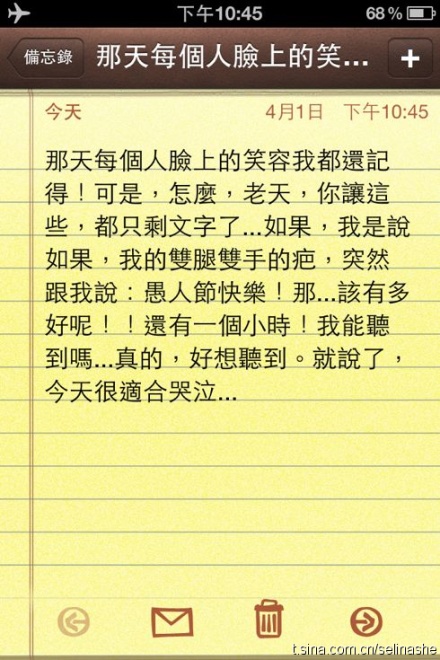 Selina昨日深夜發(fā)文。圖片來自Selina微博