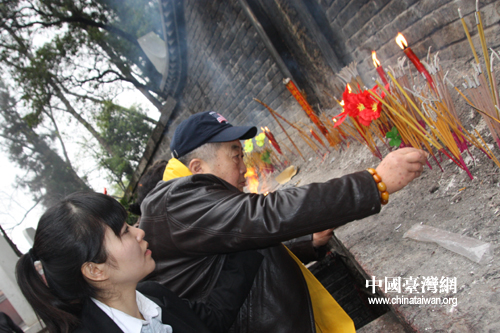 在工作人員的協(xié)助下,81歲的魯燦云老先生從陵園入口一路跋涉至炎帝陵前,虔誠為始祖敬香。(中國臺灣網(wǎng) 楊麗 攝)