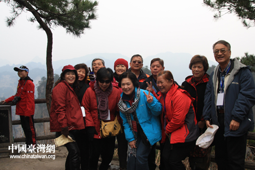 4月4日,參加第二屆在臺(tái)湘籍后裔湖南行的臺(tái)灣鄉(xiāng)親在張家界國家森林公園快樂游覽。(中國臺(tái)灣網(wǎng) 楊麗 攝)