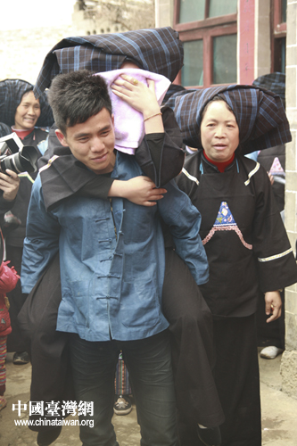 新娘由弟弟背著離開閨房,她用布巾蒙臉,痛哭著走向花轎。(中國臺灣網(wǎng) 陳佳慧 攝)