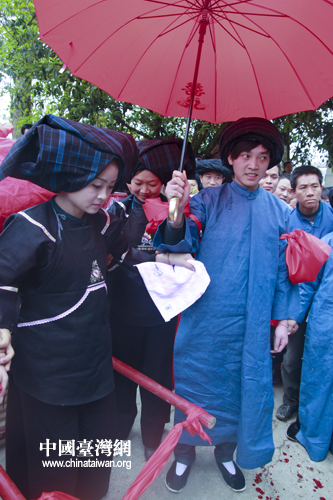 新郎打著紅傘迎接新娘下轎。(中國臺灣網(wǎng) 陳佳慧 攝)