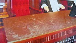 一旁戒護(hù)的法警一時錯愕,來不及因應(yīng),反倒是在一旁看資料的張益昌,一個箭步?jīng)_上前從后面拉住已一腳踏上記者席的黃詩斌。黃隨后再撒一把胡椒粉,張益昌右眼被撒到,頓時難以睜眼,仍奮力一把抓下黃詩斌,黃的頭撞到木門,還企圖從側(cè)門逃遁,但被張益昌和2名法警合力制伏。