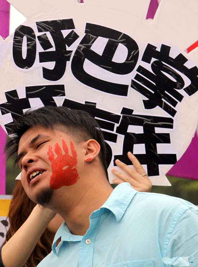 中國臺灣網(wǎng)4月22日消息 據(jù)臺灣媒體報(bào)道,臺灣反貧困聯(lián)盟、臺灣勞工陣線、社會住宅聯(lián)盟、卡債受害自救會等團(tuán)體,今(22)日在凱達(dá)格蘭大道上抗議,號召弱勢族群及青年世代參與反貧困五一大游行。青年代表今日也在現(xiàn)場上演行動(dòng)劇,5個(gè)年輕人被大型道具手呼巴掌,每個(gè)巴掌分別代表債務(wù)、學(xué)貸、派遣、過勞、失業(yè)等。