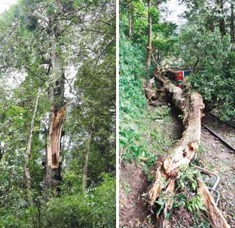 飛來橫禍,砸中阿里山小火車的青剛櫟樹,斷裂的樹干橫躺在鐵軌上。圖片來源:臺灣媒體