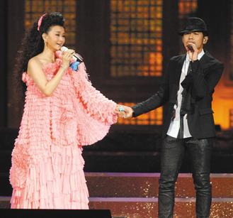 宋祖英(左)與周杰倫牽手合唱,臺下爆出如雷掌聲。圖片來源:臺灣《聯(lián)合報》