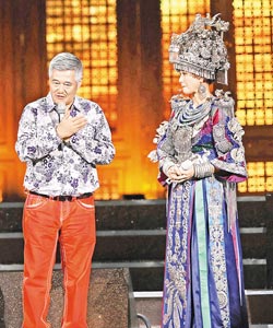 這次演唱會(huì)斥資上億新臺(tái)幣,7個(gè)升降舞臺(tái),開場(chǎng)數(shù)十位舞者跳《百鳥朝鳳》,接著宋祖英穿金碧輝煌孔雀裝出場(chǎng),一曲《我用山歌敬親人》清脆嗓音響徹天際,搭配194名臺(tái)北愛樂及合唱團(tuán)演出,氣勢(shì)磅礡。周董和她合唱《千里之外》、《黃浦江深》,并稱“這次比之前更緊張!弊蛲碜鶡o虛席,張小燕、陳文茜、趙本山、郝龍斌、白冰冰、陳美鳳、邱復(fù)生、吳宗憲都是觀眾。(中國臺(tái)灣網(wǎng) 馮存健)