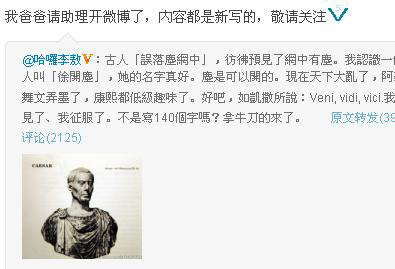 李敖在首篇博文中表示,古人“誤落塵網(wǎng)中”,彷佛預(yù)見了網(wǎng)中有塵。我認(rèn)識(shí)一位可愛的女人叫“徐開塵”,她的名字真好。塵是可以開的,F(xiàn)在天下大亂了,阿貓阿狗都會(huì)舞文弄墨了,“康熙”都低級(jí)趣味了。好吧,如凱撒所說:Veni, vidi, vici.我來了、我看見了、我征服了。不是寫140個(gè)字嗎?拿牛刀的來了。
