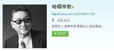 李敖17日在某大陸網(wǎng)站開設(shè)微博,引發(fā)不小的轟動(dòng)。圖片截自李敖微博
