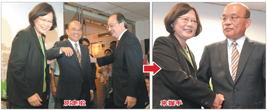 民進(jìn)黨主席蔡英文與蘇貞昌19日“蔡蘇會(huì)”,氣氛略顯尷尬。在民進(jìn)黨內(nèi)大佬柯建銘要求下,蔡、蘇才“配合演出”,握手20多秒給媒體拍照,蘇貞昌還打趣說(shuō):“我頭發(fā)要不要梳一下?” 圖片來(lái)源:臺(tái)灣《聯(lián)合報(bào)》