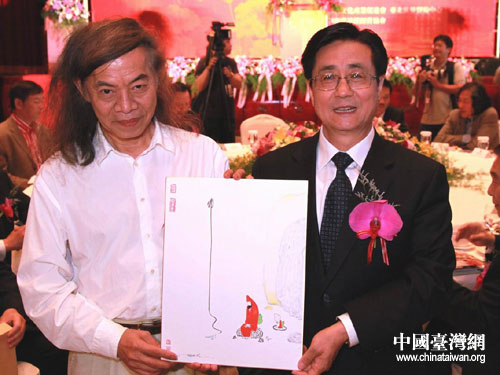 臺灣漫畫家蔡志忠贈送作品給趙洪祝書記。(浙江省臺辦王健 攝)