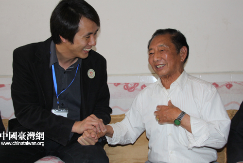 邵應(yīng)壬老兵見到蔡秉憲等臺灣同學(xué)們時分外激動,他們的手緊緊握在一起。(中國臺灣網(wǎng) 楊永青 攝)