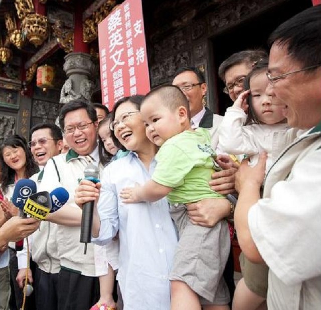 民進(jìn)黨主席蔡英文1日下午到桃園五福宮上香,單手抱起胖小孩。圖片來源:臺灣媒體