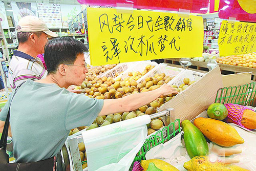 量販店的水果販賣區(qū)域昨人潮絡(luò)繹不絕,奇異果、西瓜、木瓜等都很受歡迎,還有連鳳梨都來不及端到架上,就有民眾直接在紙箱內(nèi)選購起來。店員還透露,水果從開店就一直不停補(bǔ)貨到晚上,相當(dāng)熱賣。