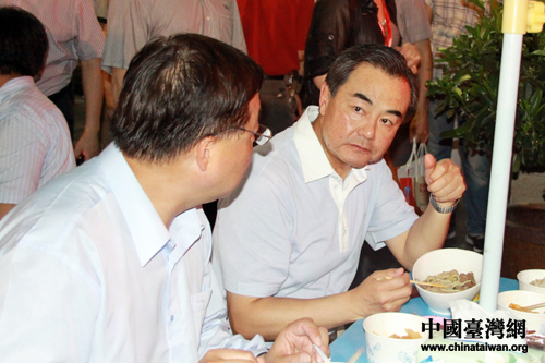 王毅品嘗臺(tái)灣特色美食——牛肉面,并與銷(xiāo)售業(yè)者親切交談。(中國(guó)臺(tái)灣網(wǎng) 王偉 攝)