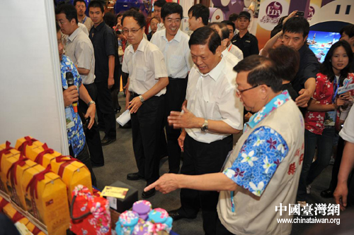 臺灣新竹縣縣長邱鏡淳向北京市領(lǐng)導(dǎo)介紹臺灣旅游產(chǎn)品(圖片來源:北京市臺辦)