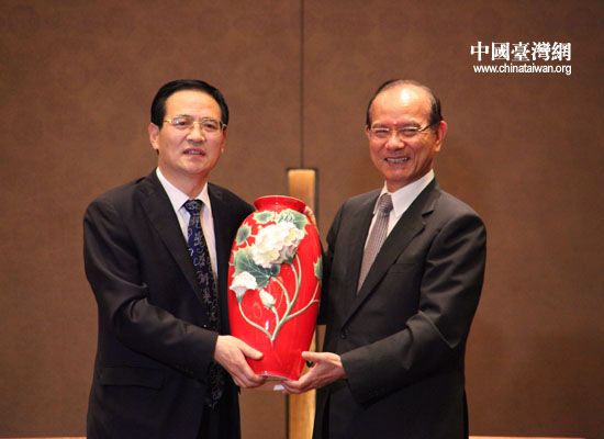 中共河北省委副書記付志方與中國國民黨榮副主席林豐正互贈禮品(攝影 中國臺灣網(wǎng) 陳寧)