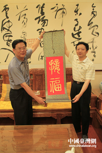 宋慶齡基金會(huì)副秘書長(zhǎng)喬健與臺(tái)灣十大杰出青年辦公室主任彭銘淵交換禮物。(中國(guó)臺(tái)灣網(wǎng) 趙婧 攝)