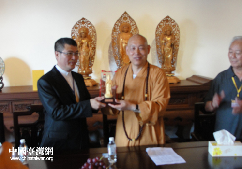 臺灣金蘭會會長臺南正統(tǒng)鹿耳門圣母廟主委王增榮與普陀山佛教協(xié)會會長道慈大和尚代表雙方互換禮物(圖片來源:舟山市臺辦)