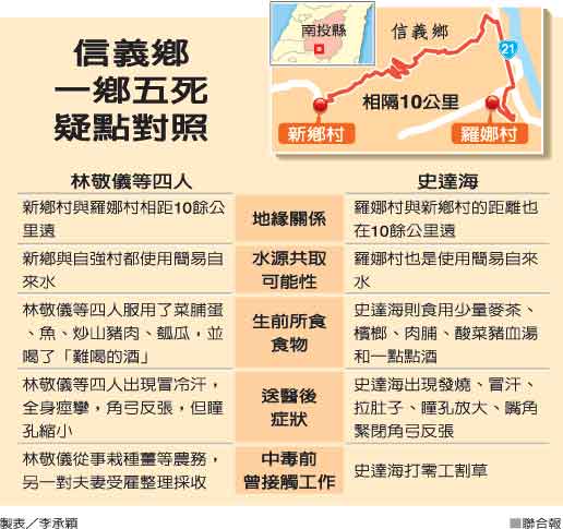 死亡的5人同鄉(xiāng)不同村,4天前離奇死亡的林敬儀夫婦住新鄉(xiāng)村,另一對(duì)夫婦田福榮受林雇用,在林家用餐后回自強(qiáng)村住處,4人先后死亡,都出現(xiàn)嘴角微翹“詭異的笑臉”死法。