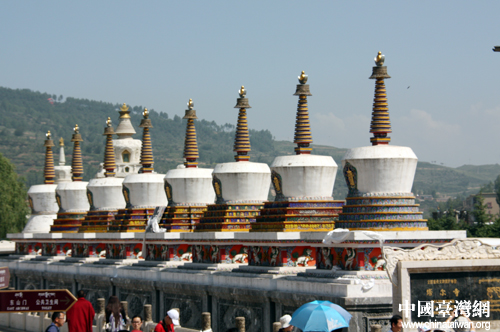 塔爾寺廣場(chǎng)矗立的如來八塔,用來贊頌佛祖釋迦牟尼一生的八大功德。(中國臺(tái)灣網(wǎng) 楊云濤 攝)