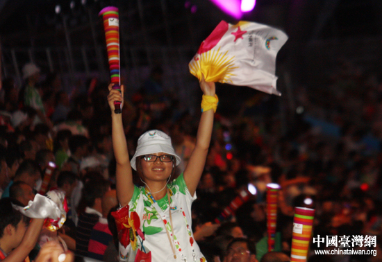 開幕式中,看臺(tái)上的志愿者盡力調(diào)動(dòng)觀眾情緒。(中國臺(tái)灣網(wǎng) 王思羽 攝)