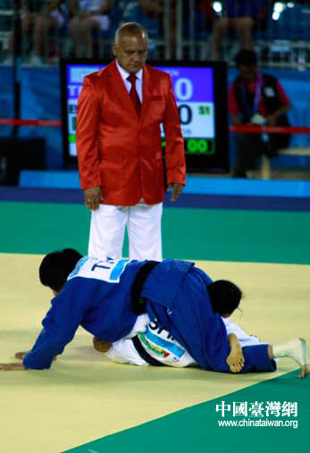 中華臺北隊選手連珍羚緊緊壓制住對手。(中國臺灣網(wǎng) 劉海偉 攝)
