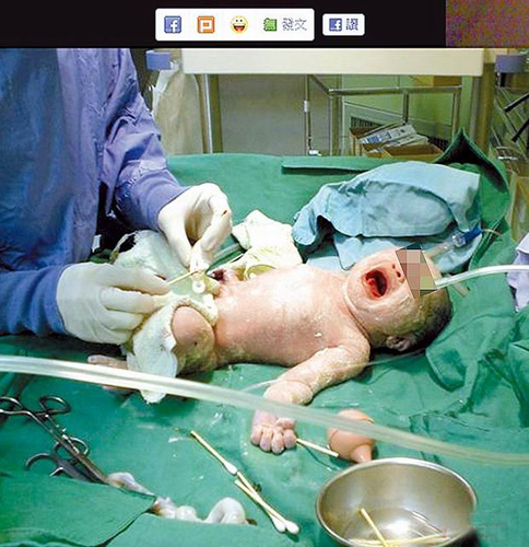 醫(yī)護(hù)人員為胎脂未掉的新生兒整理臍帶的畫(huà)面也入鏡。圖片來(lái)源:臺(tái)灣媒體
