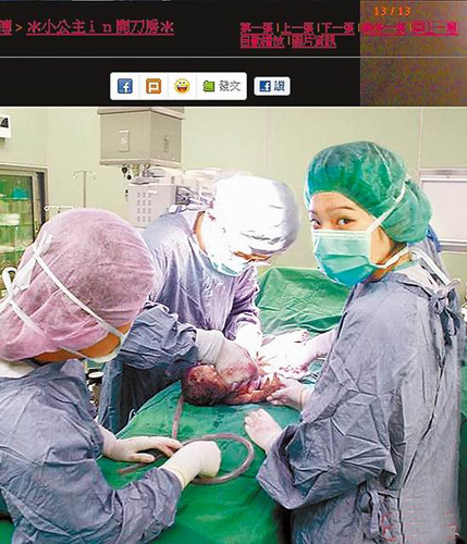 為產(chǎn)婦接生的過程中,有醫(yī)護(hù)人員轉(zhuǎn)頭看鏡頭,沒專注于手術(shù)。圖片來源:臺(tái)灣媒體