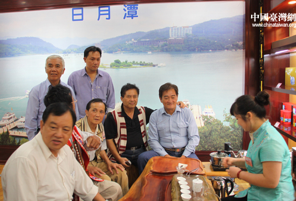 來自南投縣的臺(tái)灣少數(shù)民族客人們?cè)谏虉?chǎng)的“南投館”品茶。(中國(guó)臺(tái)灣網(wǎng) 芮益芳 攝)