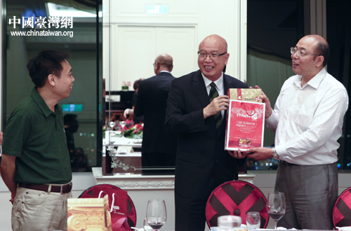 康師傅集團華北地區(qū)董事長張百清在臺北101大樓會見“康師傅橋——大陸網(wǎng)絡(luò)媒體高層赴臺交流參訪團”一行,圖為雙方互贈禮物。(中國臺灣網(wǎng) 陳佳慧 攝)