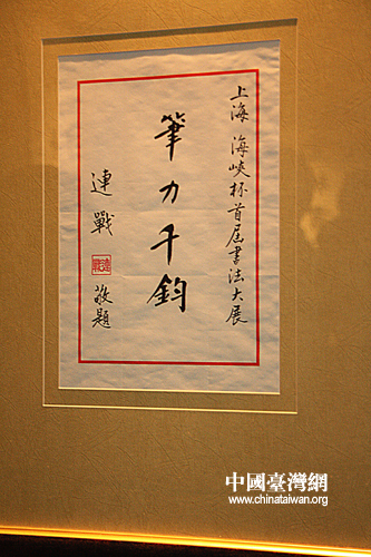 中國國民黨榮譽主席連戰(zhàn)的書法作品“筆力千鈞”(中國臺灣網(wǎng) 李桂英 攝)