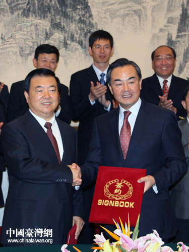 國臺辦與安徽省14日在北京簽署了促進(jìn)皖臺交流合作備忘錄,圖為國臺辦主任王毅(右)與安徽省省長王三運(yùn)(左)交換備忘錄文本。(中國臺灣網(wǎng) 楊麗 攝)