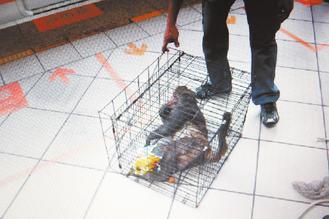 高雄市消防局表示,昨天上午九時(shí)九分,左營站員工發(fā)現(xiàn)第三站臺(tái)內(nèi)側(cè)梁柱上有只獼猴亂竄,立即出動(dòng)多人,攜帶捕獸夾、捕獸網(wǎng)及鐵籠趕往。獼猴非常機(jī)警,見一群人“來意非善”,在站臺(tái)梁柱間跳來蕩去,再由站臺(tái)外側(cè)往大廳梁柱移動(dòng),把后面“始終慢一步”的圍捕人員急得團(tuán)團(tuán)轉(zhuǎn)。 圍捕人員力斗不過想智取,拿出香蕉誘捕,獼猴跳下來撿起香蕉大口吃,但圍捕人員靠近,獼猴立即跳上梁柱,亂得他們只好干瞪眼。