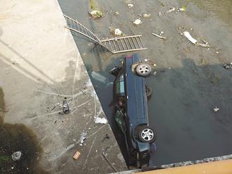 江姓婦人向警方表示,早上駕車出門,由南向北經(jīng)過該路口,由西向東行駛的黑色轎車突然竄出,她反應(yīng)不及撞上,黑色轎車失控撞斷河岸護(hù)欄后掉落河床。