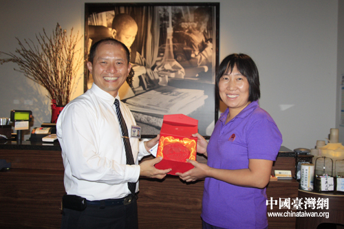 清華大學(xué)學(xué)生處教師曹愛紅與慈濟基金會秘書處專員劉鈞安交換禮物(中國臺灣網(wǎng) 徐維彬 攝)