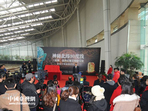 “神秘北緯30°線——三星堆、金沙古蜀文明秘寶展”赴臺文物裝箱起運(yùn)儀式在成都市金沙遺址博物館舉行。(圖片來源:四川省臺辦)