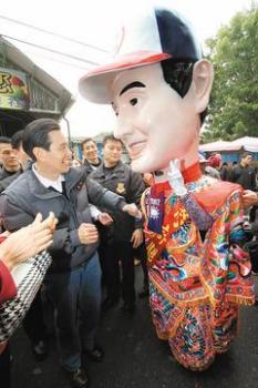 馬英九(左)上午前往南投拜票,看見(jiàn)自己競(jìng)選的大人偶,喜笑顏開(kāi)。(圖片來(lái)源于:臺(tái)灣《聯(lián)合報(bào)》)