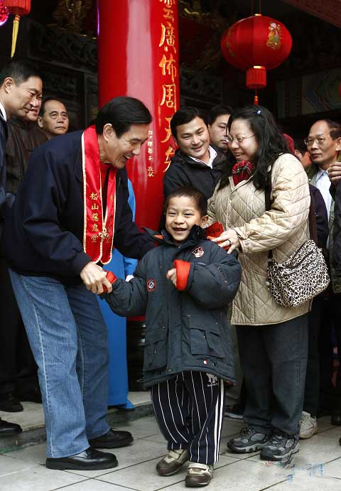 今日,馬英九在臺北市長郝龍斌的陪同下,前往松山慈惠堂參拜,祈福參拜。一早就有超過500名民眾攜家?guī)Ь烀坝昱抨?duì),等著從馬英九手中領(lǐng)取新春福袋討吉利。面對大排長龍的民眾,馬英九發(fā)福袋身手利落,1分鐘發(fā)出超過30個福袋,同時(shí)與民眾一一握手親切寒暄。
