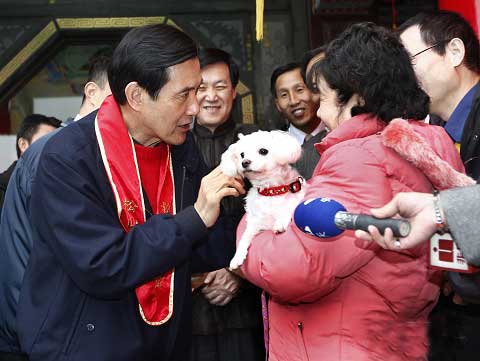 遇到熱情民眾對他說“我愛你”,馬英九也俏皮回說“我也愛你”。與戴著各式動物造型毛帽的小朋友合照時(shí),他不忘幽默補(bǔ)充說“還有一匹馬”。而看到抱寵物狗來領(lǐng)福袋的主人,馬英九則加碼多發(fā)一包福袋,開玩笑對狗兒說“這是馬小九給你的”。
