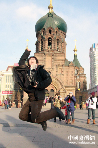 兩岸青年學子在哈爾濱圣索菲亞大教堂合影留念。(中國臺灣網 于斯文 攝)