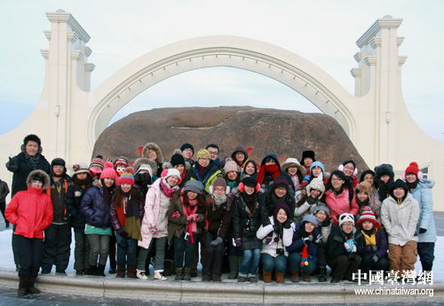兩岸青年學(xué)子在哈爾濱太陽(yáng)島上合影留念。(中國(guó)臺(tái)灣網(wǎng) 于斯文 攝)