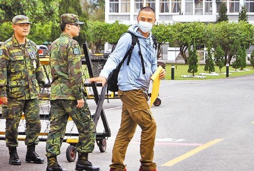 明道(右)昨依臺(tái)軍規(guī)定戴上口罩防疫,踏入宜蘭營(yíng)區(qū)。(圖片來(lái)源于:臺(tái)灣《蘋(píng)果日?qǐng)?bào)》)