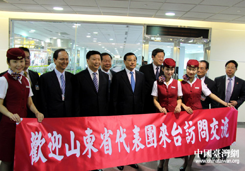 2011年7月11日,山東省省長姜大明、副省長才利民等在臺(tái)灣桃園機(jī)場受到歡迎。(圖片來源:山東省臺(tái)辦)