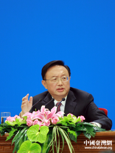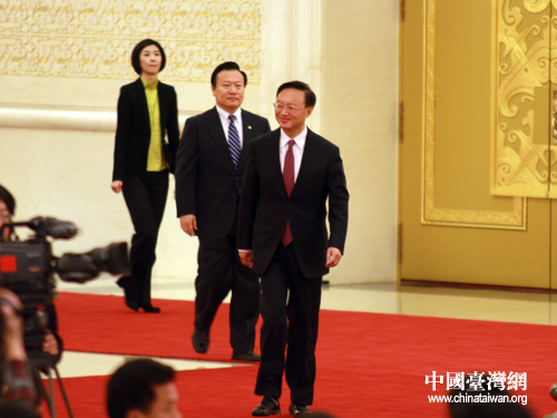 十一屆全國人大五次會議今天上午10時(shí)在人民大會堂三樓金色大廳舉行記者會。外交部部長楊潔篪向記者問候。(中國臺灣網(wǎng) 王偉 攝)