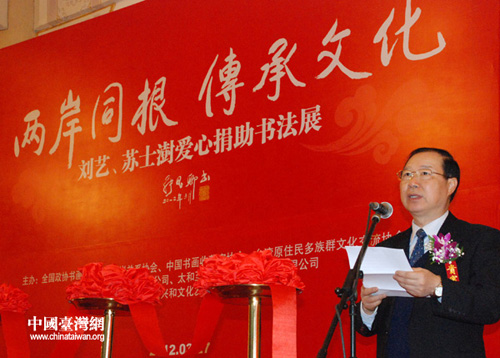 中國臺灣網(wǎng)3月28日北京消息 由全國政協(xié)書畫室、中國書畫收藏家協(xié)會主辦的“兩岸同根,傳承文化——劉藝、蘇士澍愛心捐助書法展”昨日上午在全國政協(xié)禮堂隆重舉行;顒庸舱钩鰟⑺嚒⑻K士澍兩位當代著名書法家作品80余幅。同時,兩位名家還當場向臺灣省花蓮縣秀林鄉(xiāng)捐贈人民幣300萬元籌建“愛心圖書館”。原全國政協(xié)副主席、政協(xié)書畫室主任張思卿,海峽兩岸關(guān)系協(xié)會副會長王在希,臺灣地區(qū)少數(shù)民族民意代表高金素梅等出席活動。