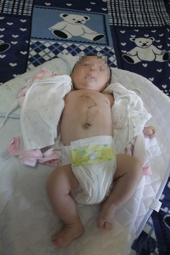 張小弟弟出生后立即手術切除寄生連體雙胞胎,術后身上留下長長疤痕。圖片來自臺媒