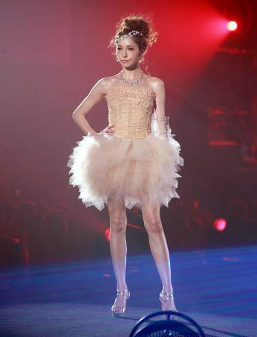 曾經(jīng)在夜店“Luxy”開唱的藤井莉娜(藤井LENA)這次擔(dān)任開場秀的主要模特兒,她一現(xiàn)身便引來少女們的尖叫歡迎,頂著嘴邊兩顆招牌美痣的她性感又可愛,身穿一襲浪漫的蓬蓬裙,與額頭、頸部的華麗水鉆相得益彰,彷佛皇宮貴族里的典雅小公主,不愧被日媒封為“時尚教主”。