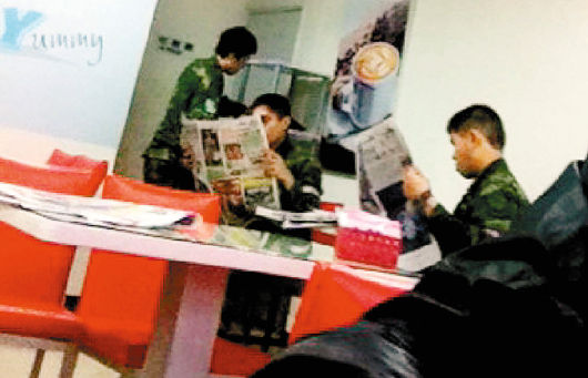 媒體報道,民眾提供照片并指出,臺軍參演部隊中,有穿著野戰(zhàn)迷彩服、戴著演習藍色臂章的官兵,于“漢光演習”期間在早餐店悠閑看報吃早餐。