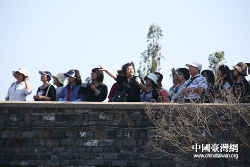在山海關(guān),臺灣民眾踏尋臺階,攀登而上,遙望遠(yuǎn)處山脈上盤旋的長城。(中國臺灣網(wǎng) 郜利敏 攝)